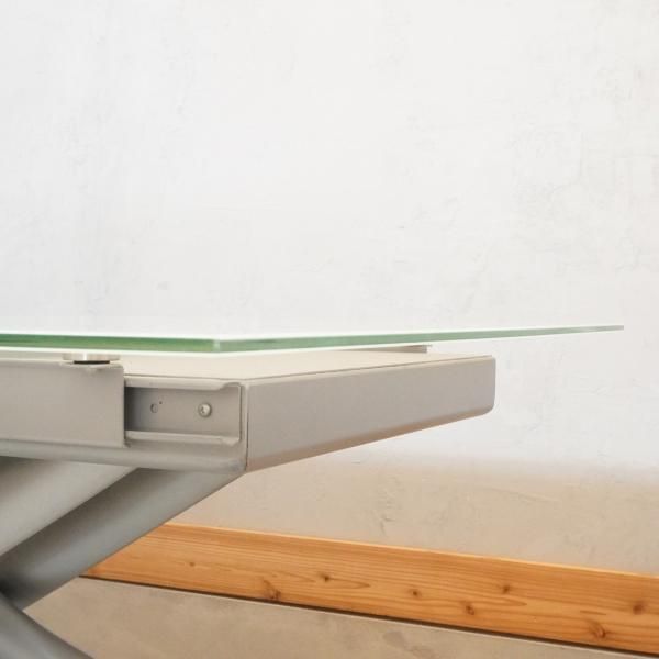 ガラス天板にシルバーのクロスした脚部の組み合わせ。