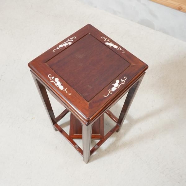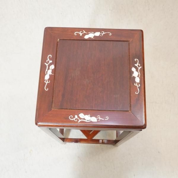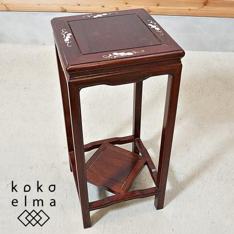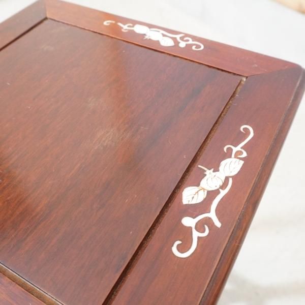 螺鈿細工が施されたアンティーク調の花梨材サイドテーブルです。葉の模様が可愛らしいデザインで、インテリアのアクセントに♪ナイトテーブルや花台、飾り台など様々な用途で活躍してくれます!