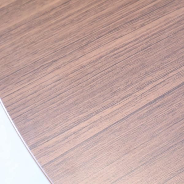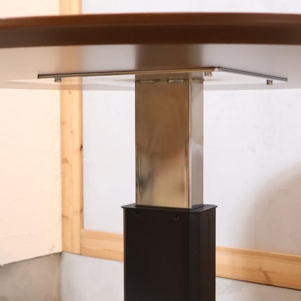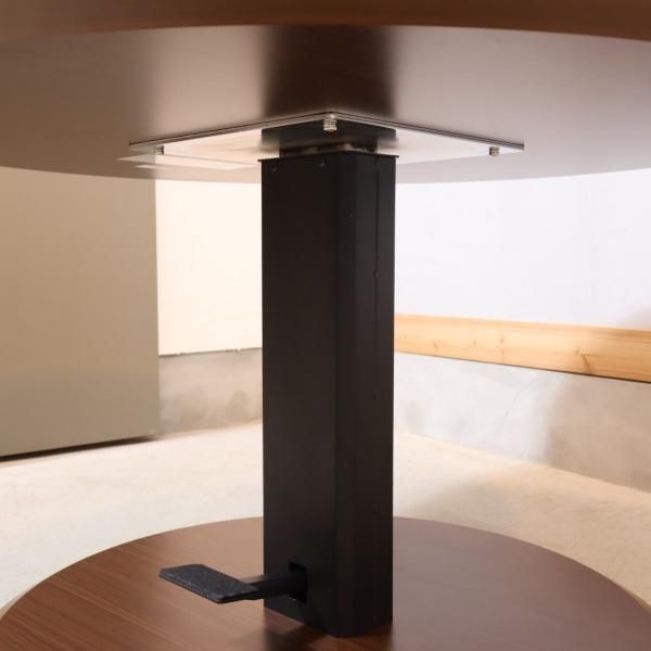 円形のシンプルなテーブルは昇降機能があるので、シーンに応じてダイニングで食卓としても、