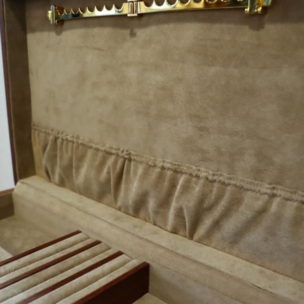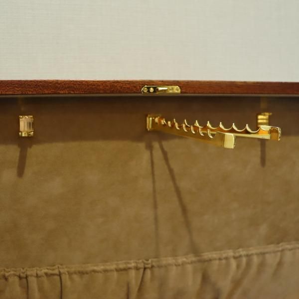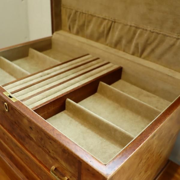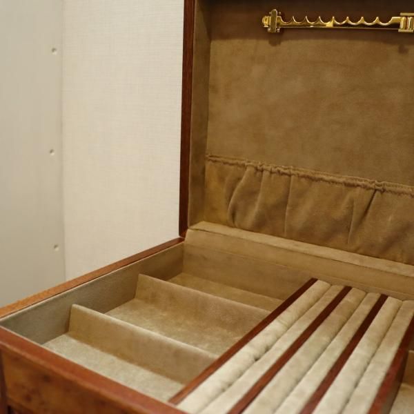 大小さまざまに仕切られたトレー、上部のフラップ扉にはネックレスバーもついたエレガントなジュエリーチェスト。