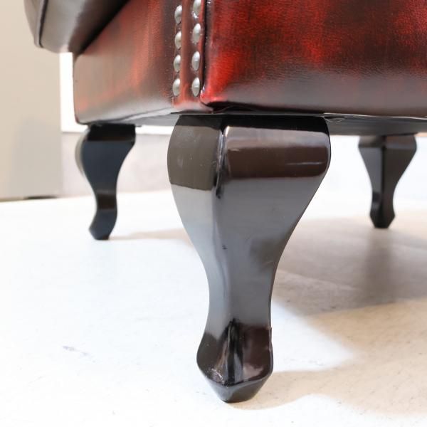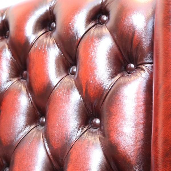 ボタン留めの伝統的な装飾がアーム部と背面にちりばめられた英国調トラッドデザイン。