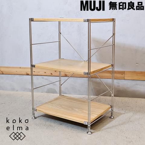 無印良品(MUJI)の人気のオーク材×ステンレス 3段ユニットシェルフです。スッキリとしたデザインはリビングの飾り棚や1ROOMなどの1人暮らしの方の本棚などにも最適なラックです。
