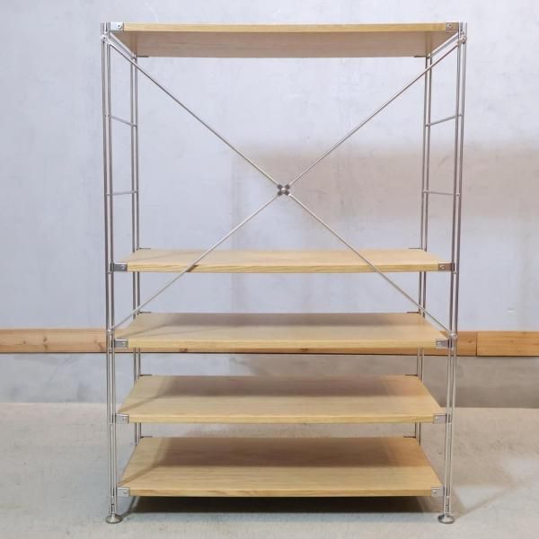 無印良品(MUJI)の人気のオーク材×ステンレス 5段ユニットシェルフです。スッキリとしたデザインはリビングの飾り棚や1ROOMなどの1人暮らしの方の本棚などにも最適なラックです。