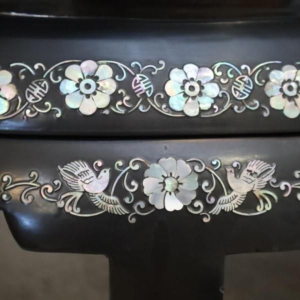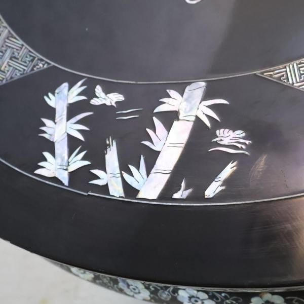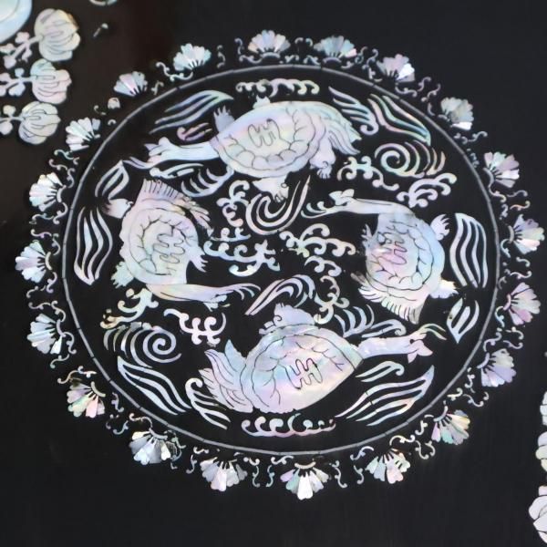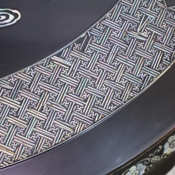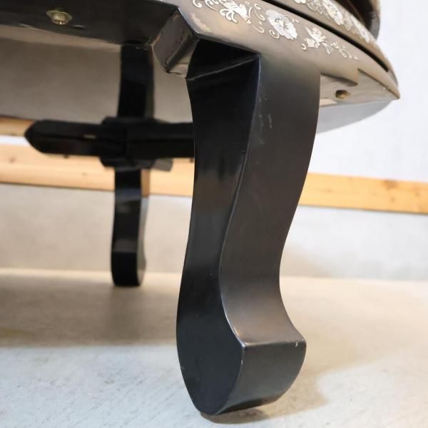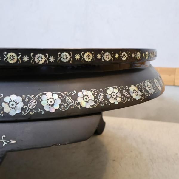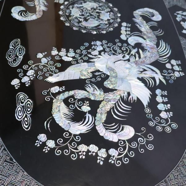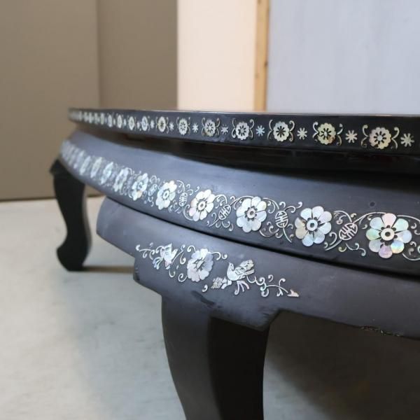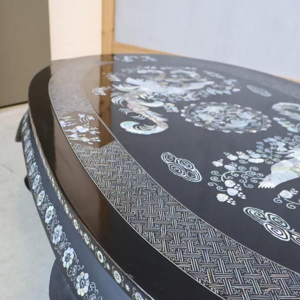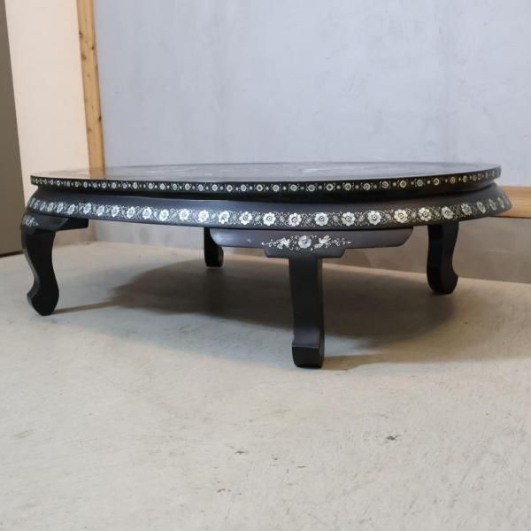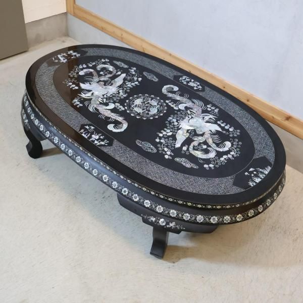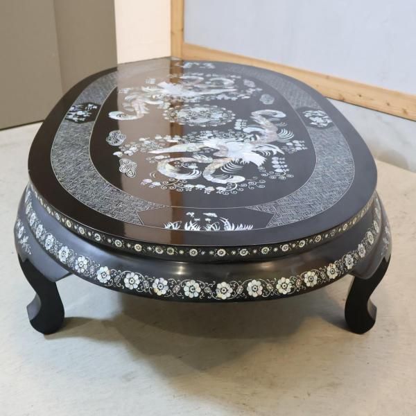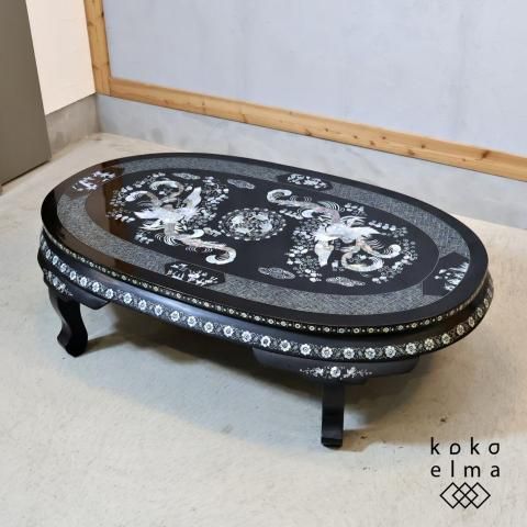 螺鈿細工が綺麗に施されたオリエンタルなローテーブルです。艶やかな光沢感と滑らかな曲線が気品溢れるオーバル型の座卓。エレガントで上品な佇まいはアジアンテイストにオススメです♪
