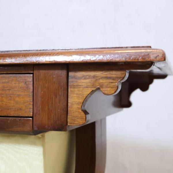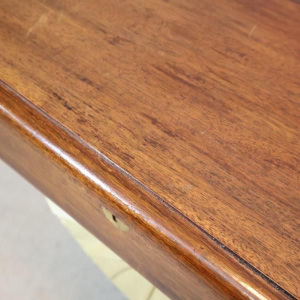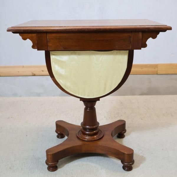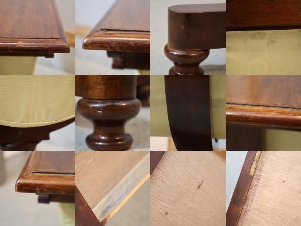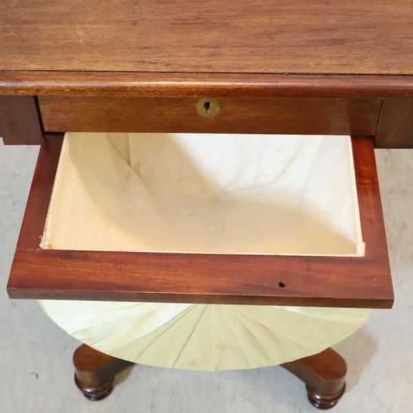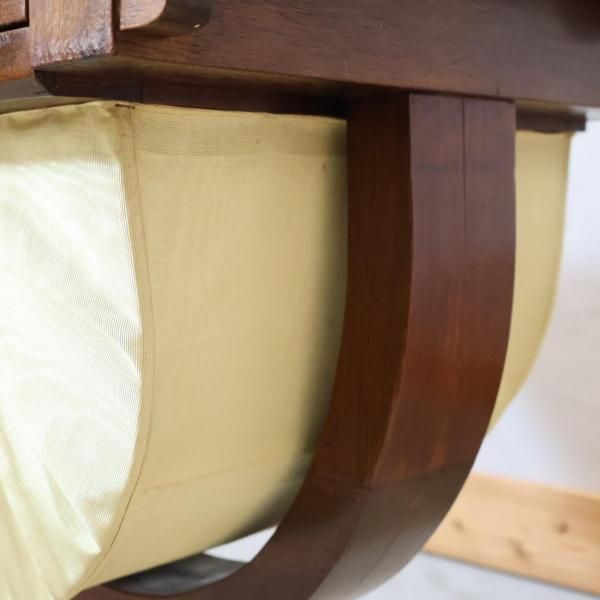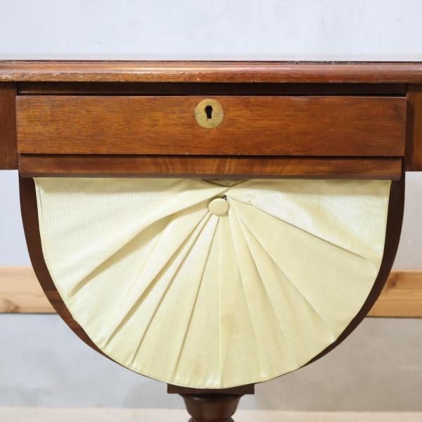 英国アンティークのマホガニー材 ソーイングテーブルです。布製のバスケットはしっとりとした光沢があり、美しいプリーツがエレガントな雰囲気に。クラシックな優雅な曲線を描くろくろ脚は上品な印象♪