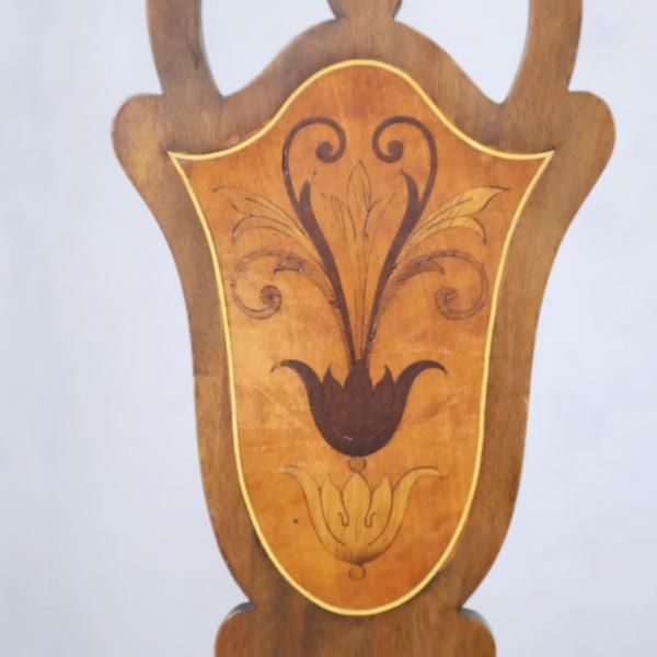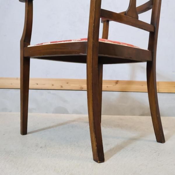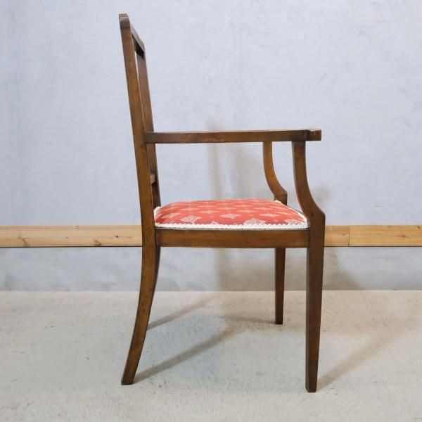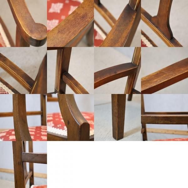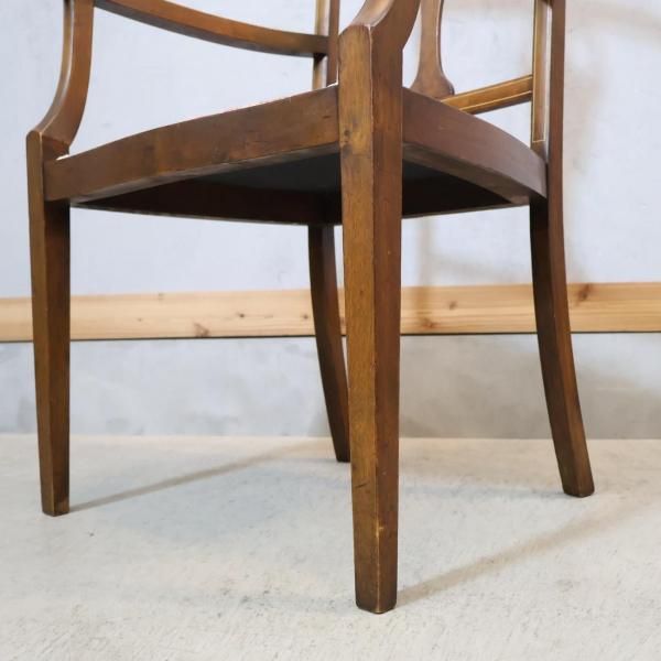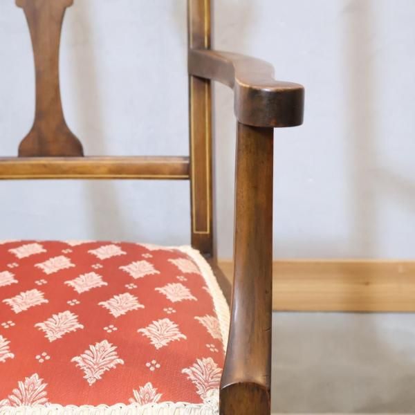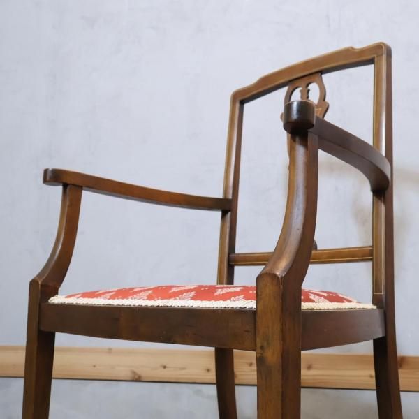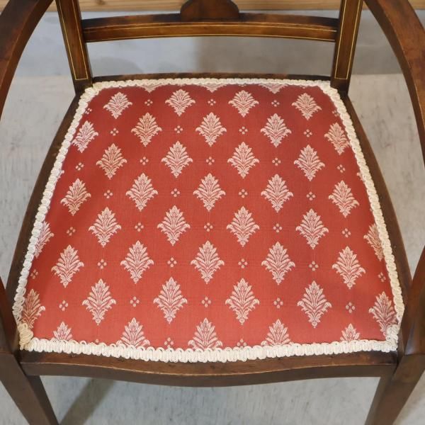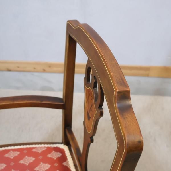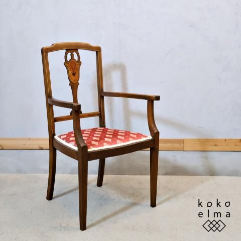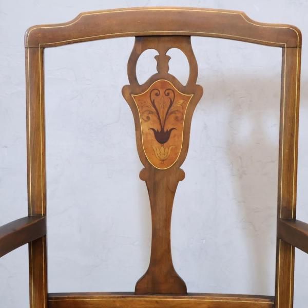 英国アンティークの象嵌細工 アームチェアです。植物のモチーフが描かれた象嵌細工が美しいダイニングチェアは、お部屋に上品で優雅な印象を与えてくれます。インテリアのアクセントに♪