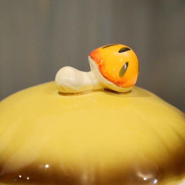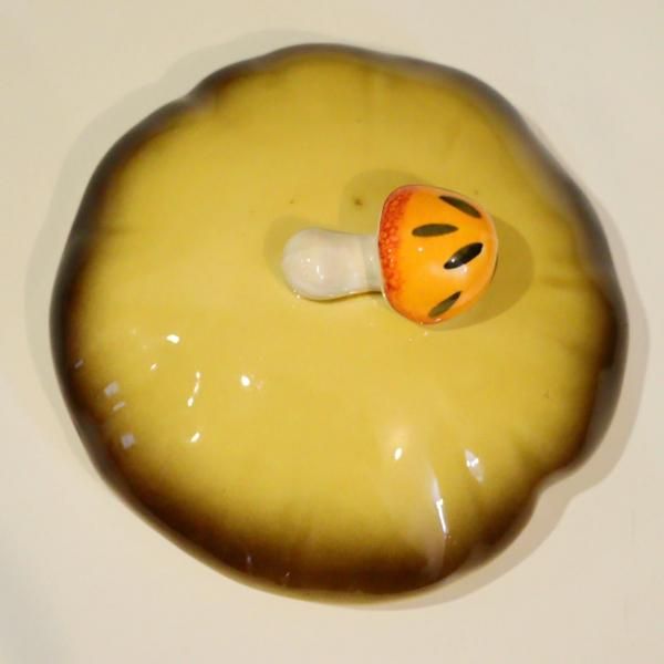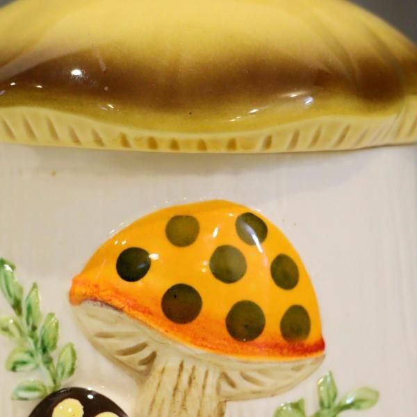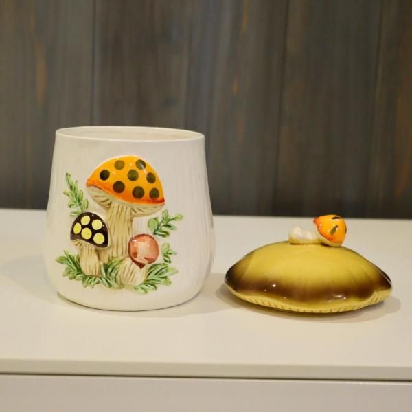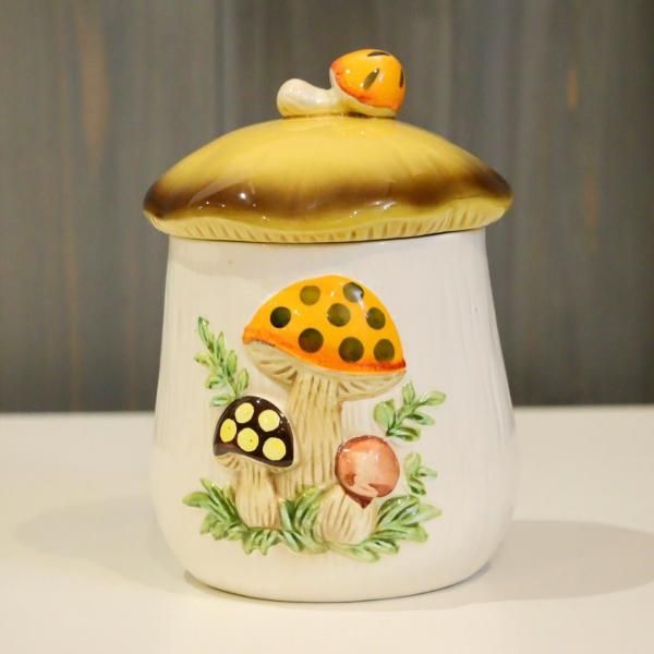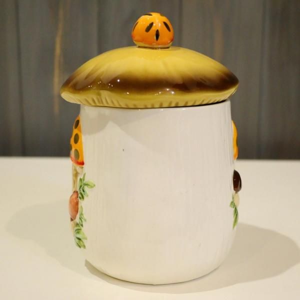 アメリカのシアーズ・ローバック社製 メリーマッシュルーム キャニスターポットです。温かみのあるカラーと立体的なキノコが愛らしいキッチンやリビングで使えるヴィンテージの小物入れ♪