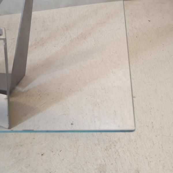”W”のようなデザインの脚が特徴的なガラスダイニングテーブル。
