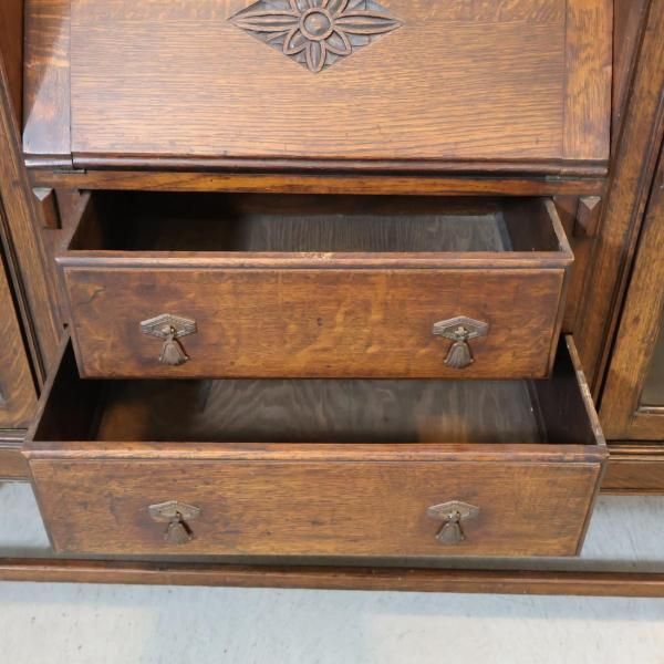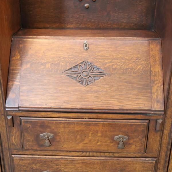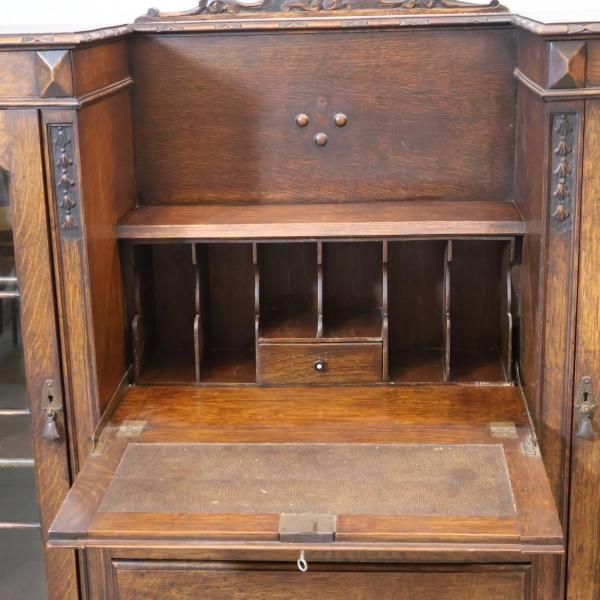 両サイドの本棚と中央のビューローが一体化したエレガントなデザインの収納家具。