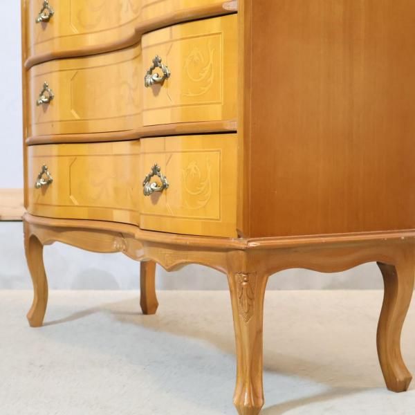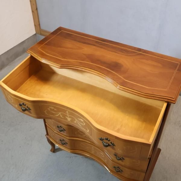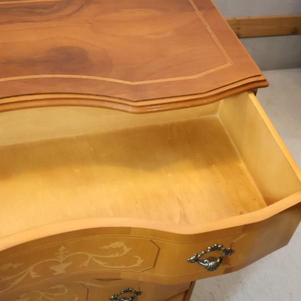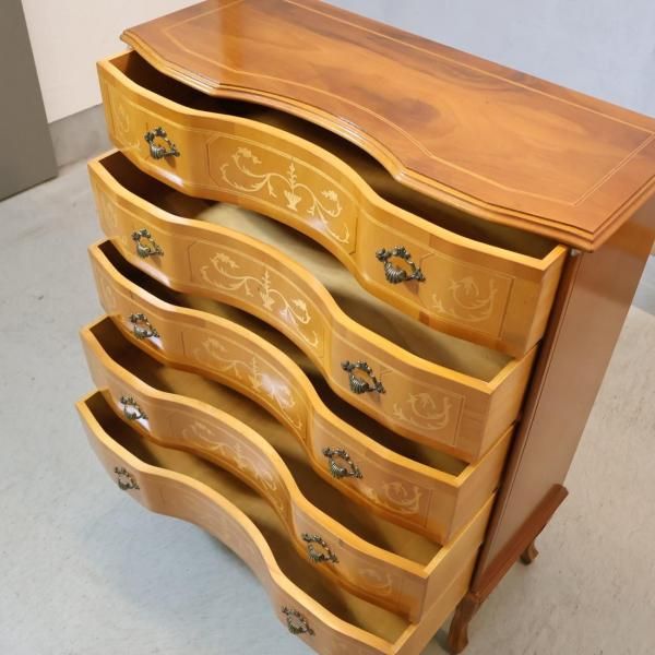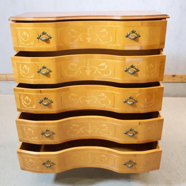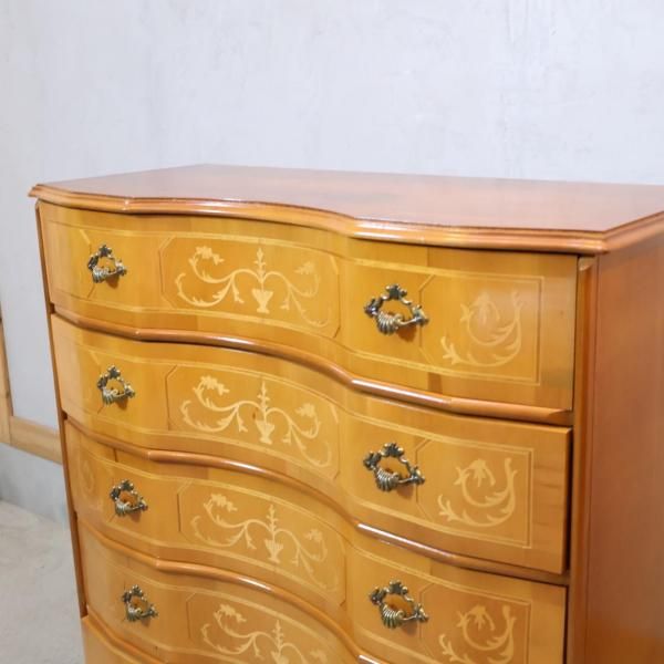 イタリア製のエレガントな5段チェストです。エレガントな象嵌細工の洋タンスはクラシックなデザインで、アンティーク調の取っ手と丸みのある脚がアクセント♪お部屋を豪華にロマンチックに演出してくれます。