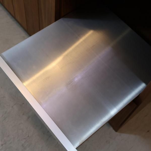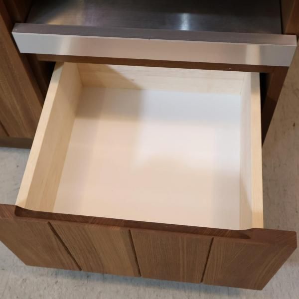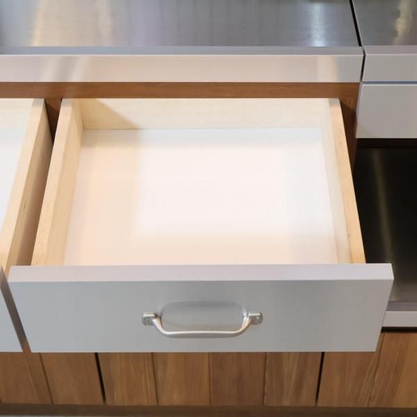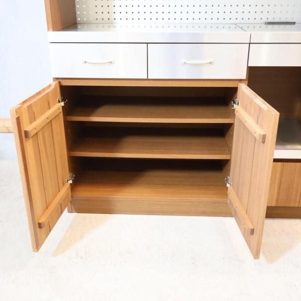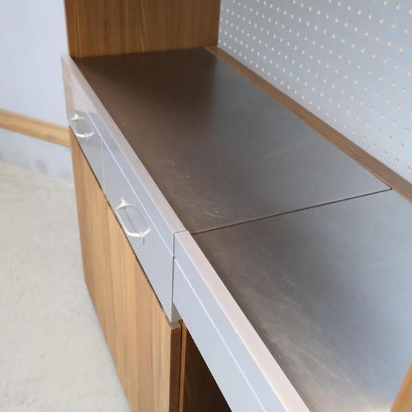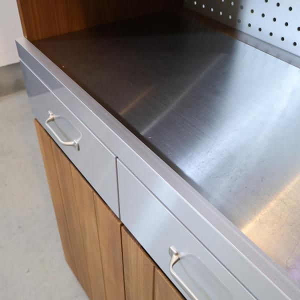 深みのある杢目調の色合いとステンレスの組み合わせがスタイリッシュなキッチンボード。
