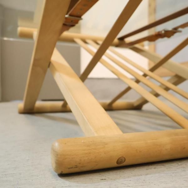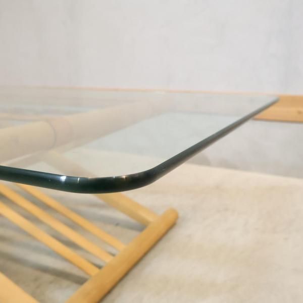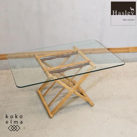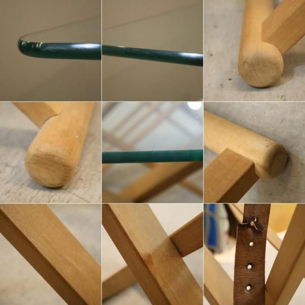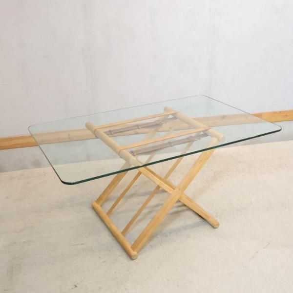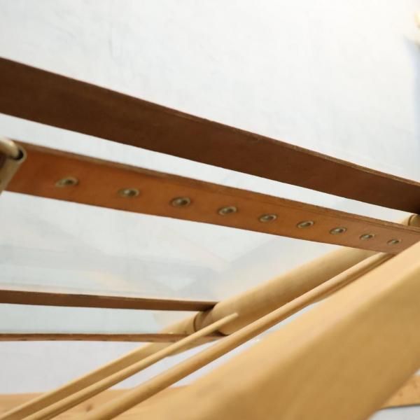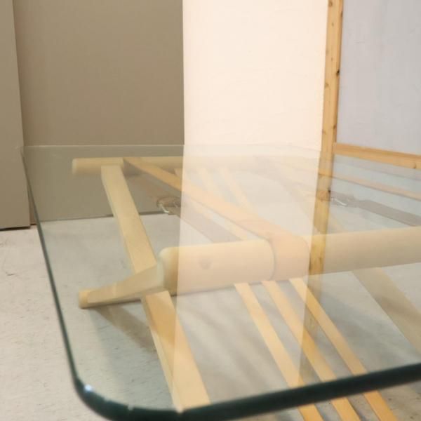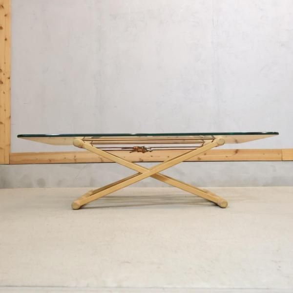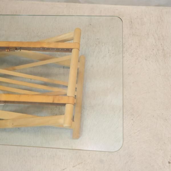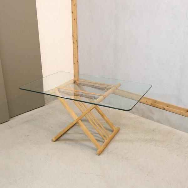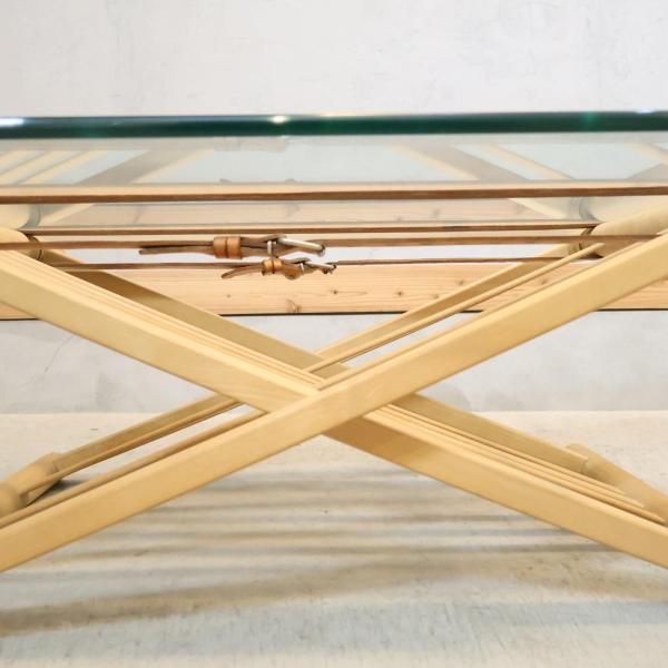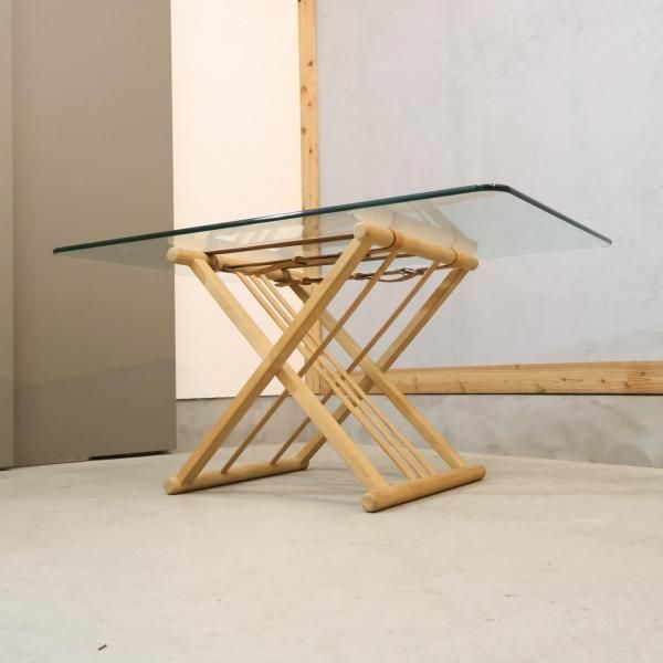 HASLEV(ハスレヴ)社の廃番稀少品、Rise&Fall(ライズアンドフォール)リビングテーブルです。ベルト部分を好みの位置で締めることでテーブルの高さを調整できる昇降式ガラステーブル。