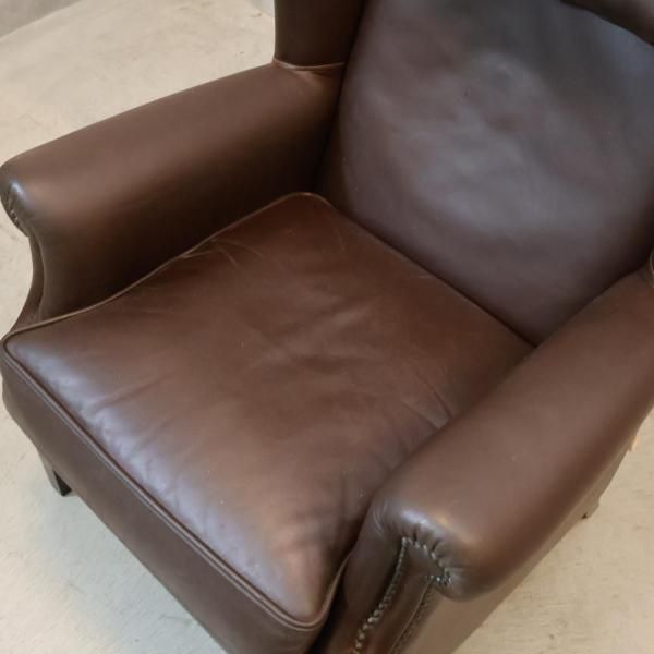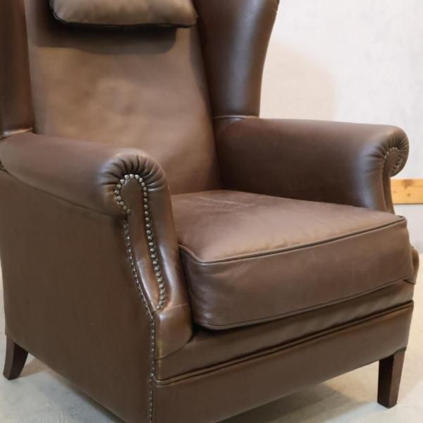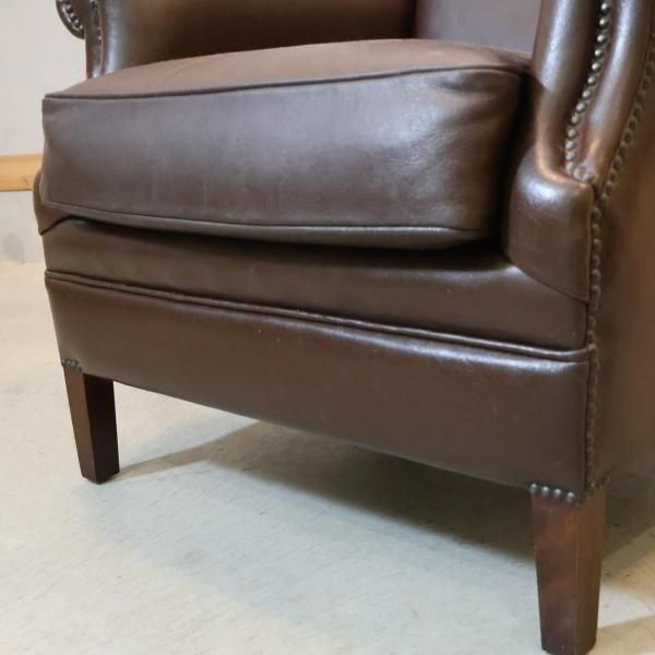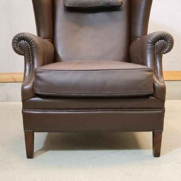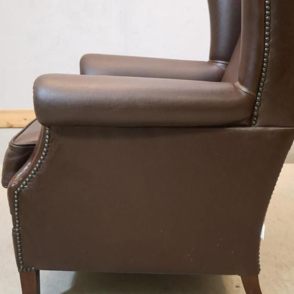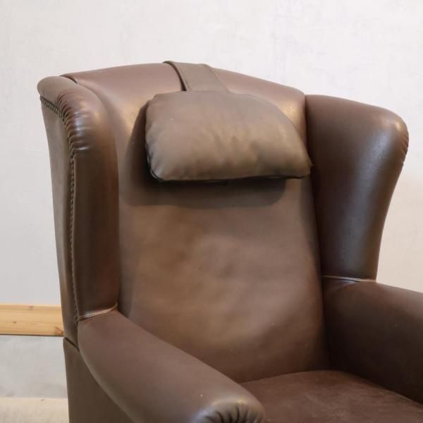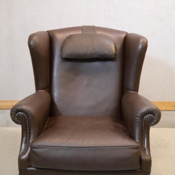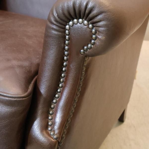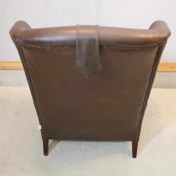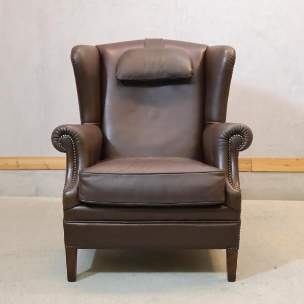 スペイン製の本革ラウンジチェアです。背もたれの高いウイングバックスタイルのクラシカルなパーソナルチェア。深みのあるダークブラウンのレザーとスタッズ飾りが重厚な雰囲気に♪